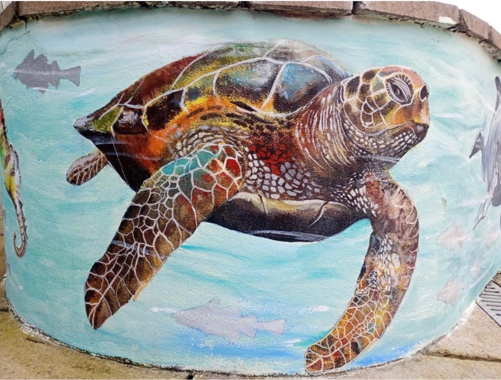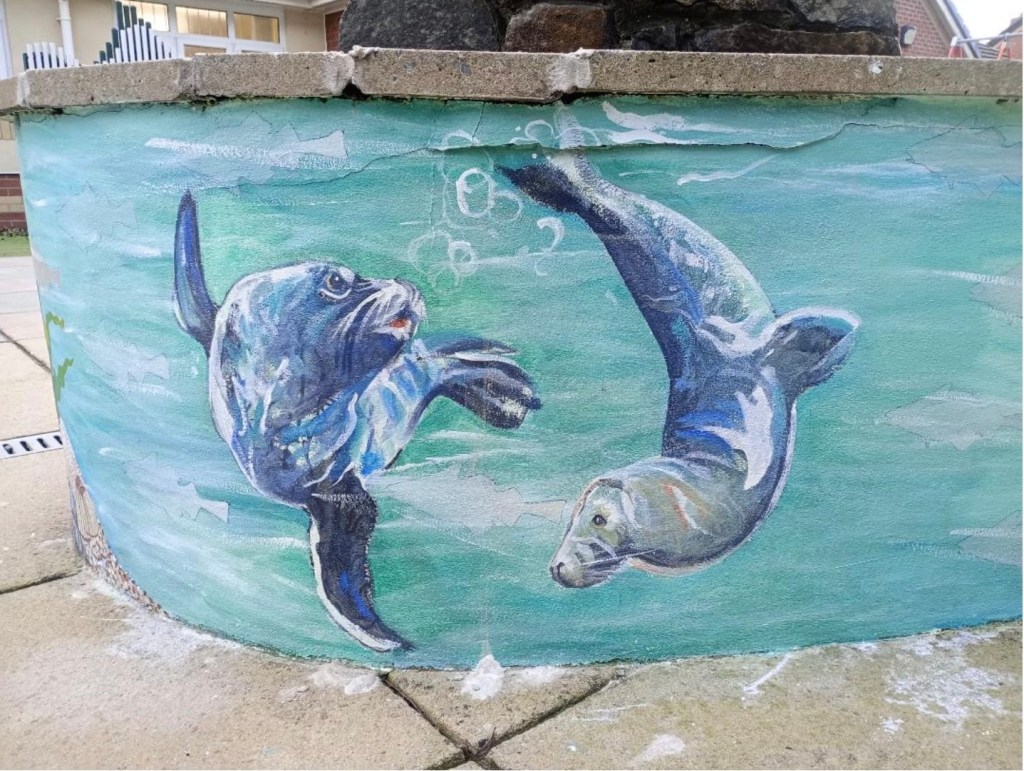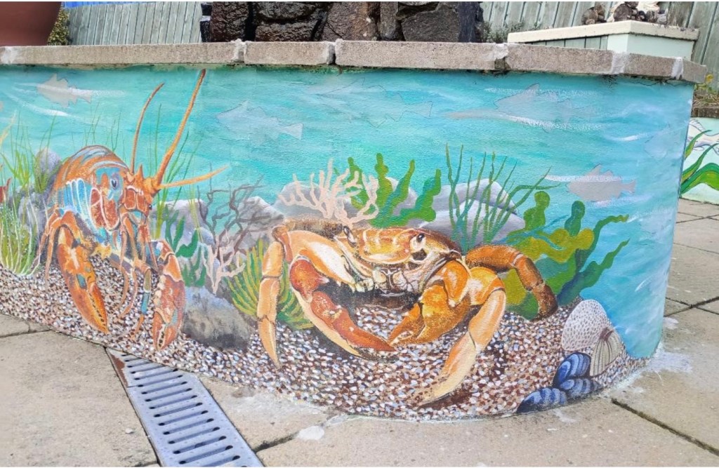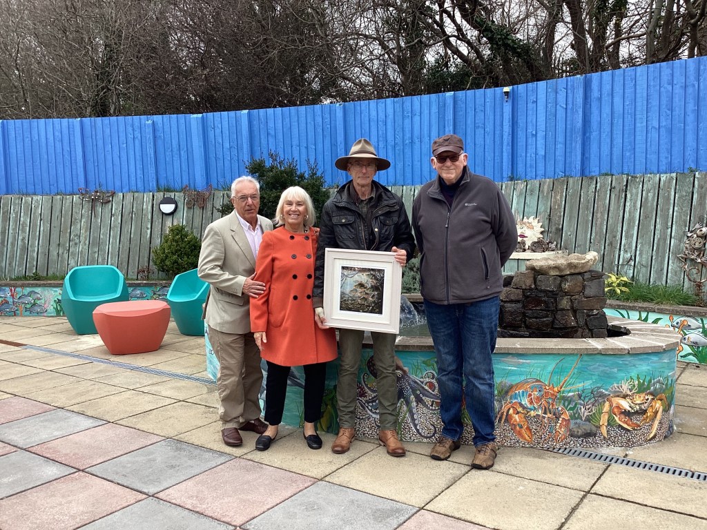 We started off with an undersea mural in Tir Einon, Llwynhendy, led by art society member William Reimnitz. Tir Einon is a respite home for severely disabled young adults. William was presented with a beautiful print by David Cowdry as a thank you. The home have erected a plaque recognising the work of Llanelli Art Society.